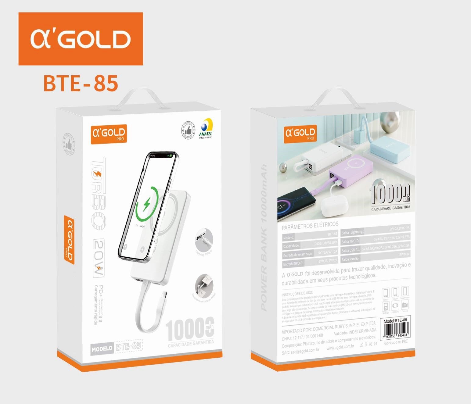 Carregador portátil A’Gold BTE-85 10000mAh cabo e indução