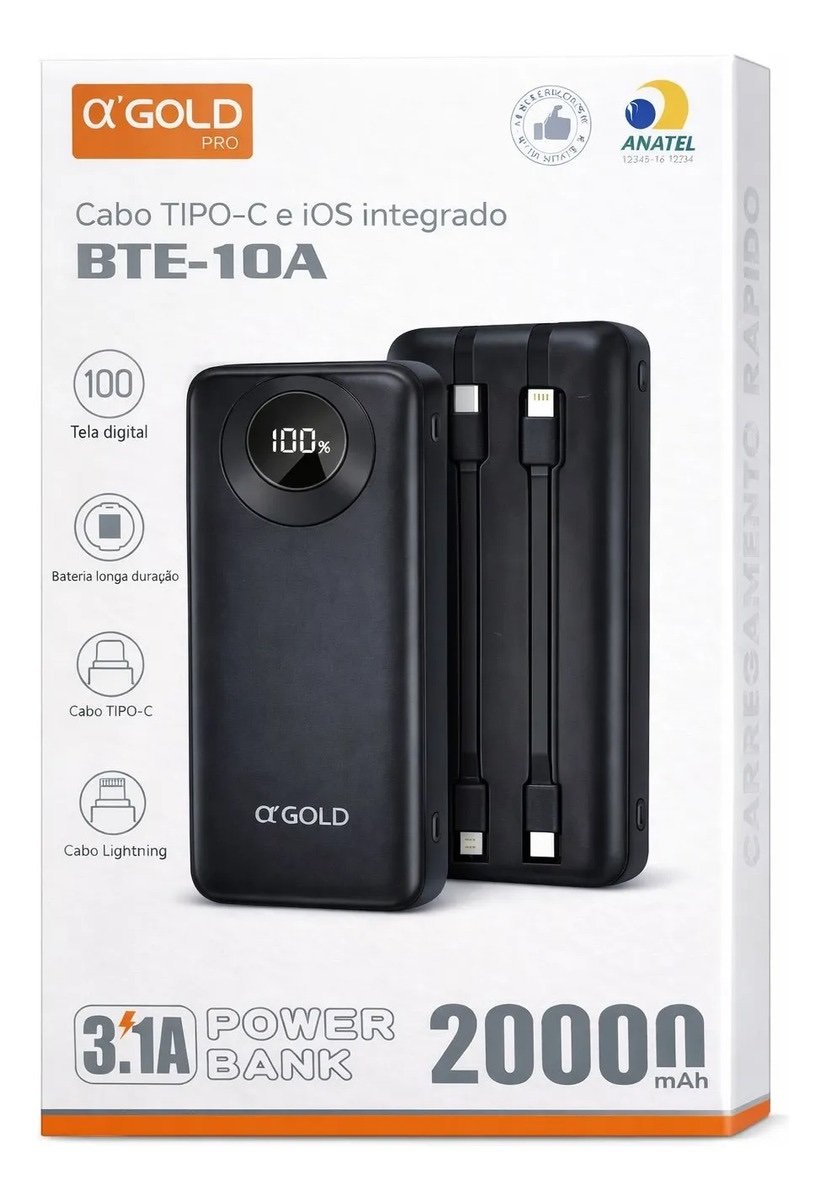 Carregador Portatil A’gold 20000mah Bte-10a Tipo C Lightning
