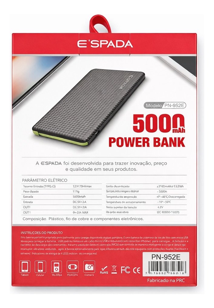 Carregador Portátil Pn-952e Espada Power Bank 5000mah Rápido