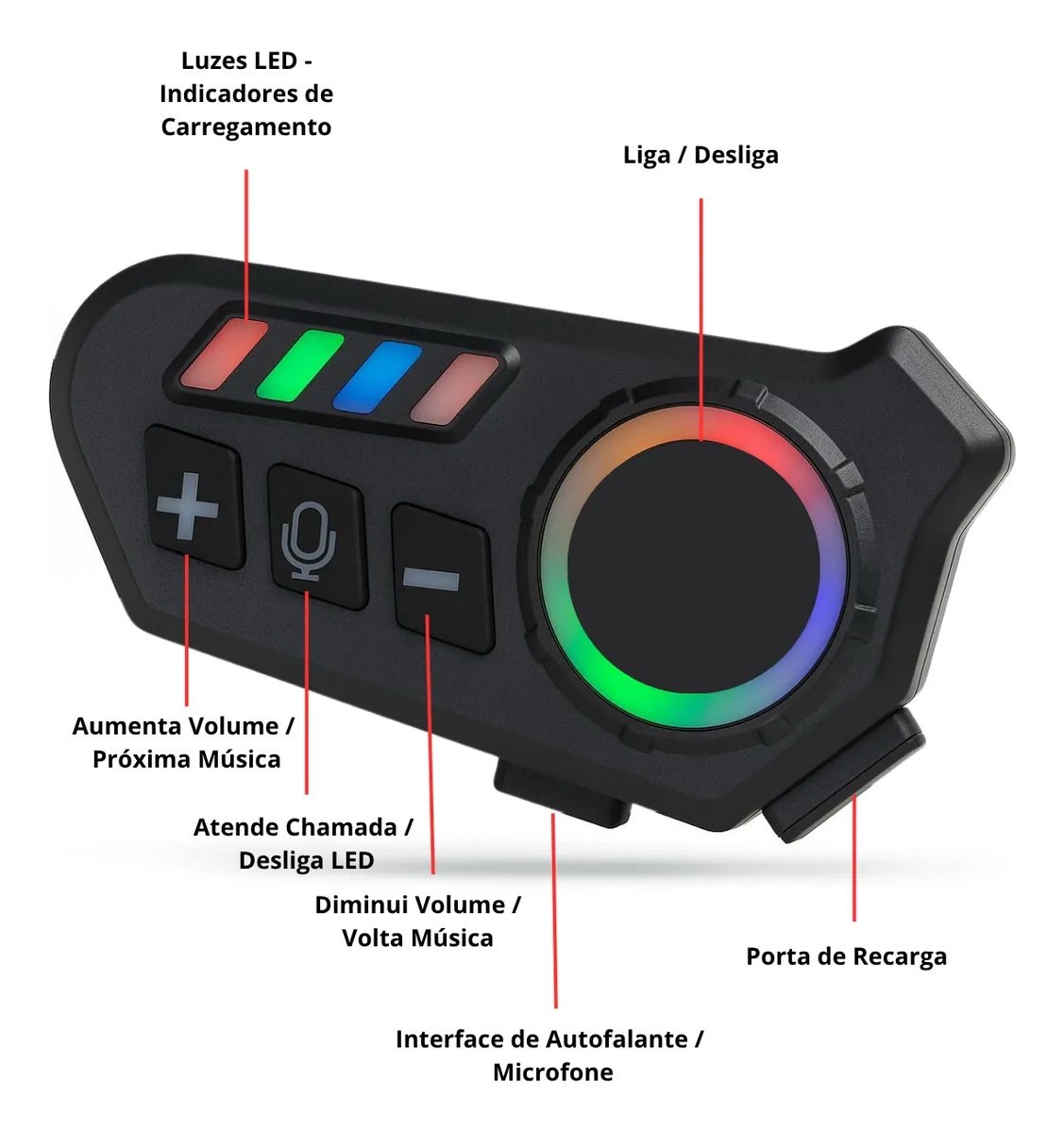 é um dispositivo Bluetooth 5.0/5.4 para capacetes, projetado para atender chamadas, ouvir música e seguir GPS com segurança. Possui design à prova d’água (IPX6), microfone com redução de ruído, bateria de 500 mAh e controles físicos funcionais, compatível com a maioria dos capacetes.